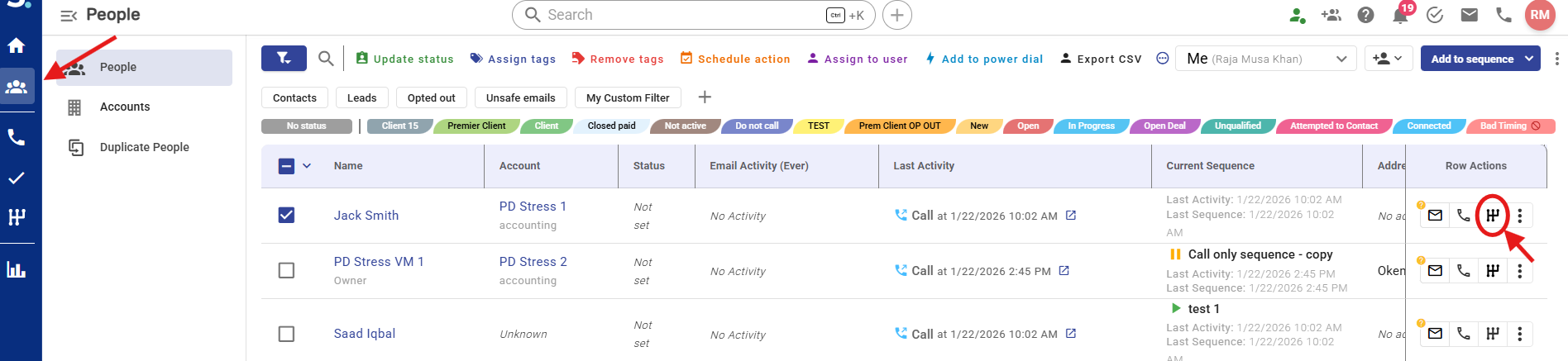 Add your desired contact to a sequence by clicking the Engage in Sequence button from the Row Actions on the right end of your contact row.