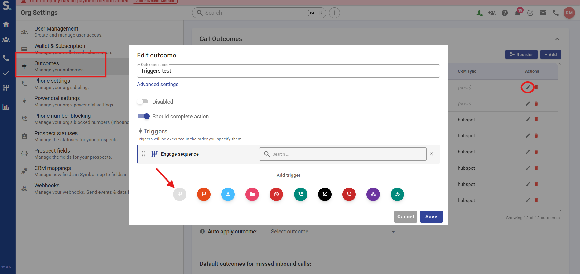 Edit an existing Call Outcome (pencil icon)